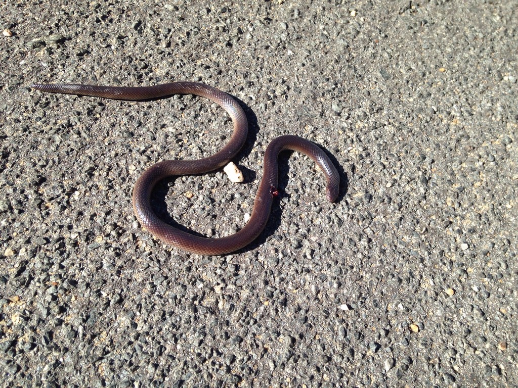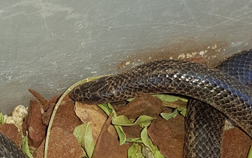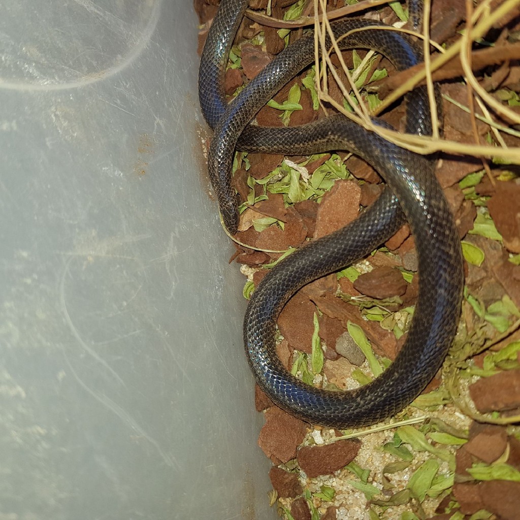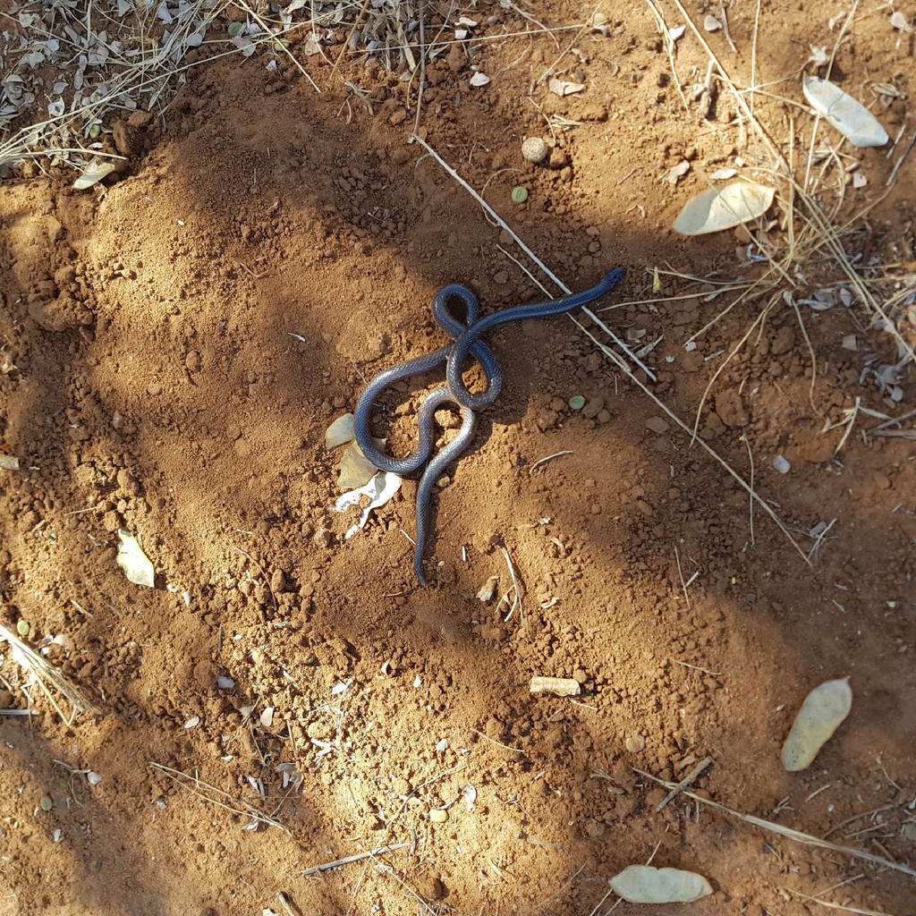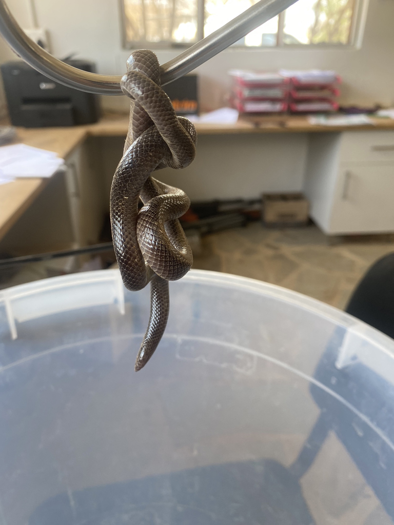 Bibron's Stiletto Snake is a dark brown to black snake with small dark beady eyes, an indistinctive neck and a blunt ending tail with a sharp tip. In certain regions this snake may have a cream white belly. When threatened, it will arch its neck and twitch around. Found through out most of Namibia, avoiding the true desert and the far south, however there are some records from Lüderitz.