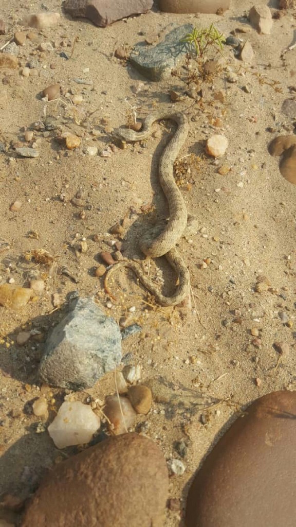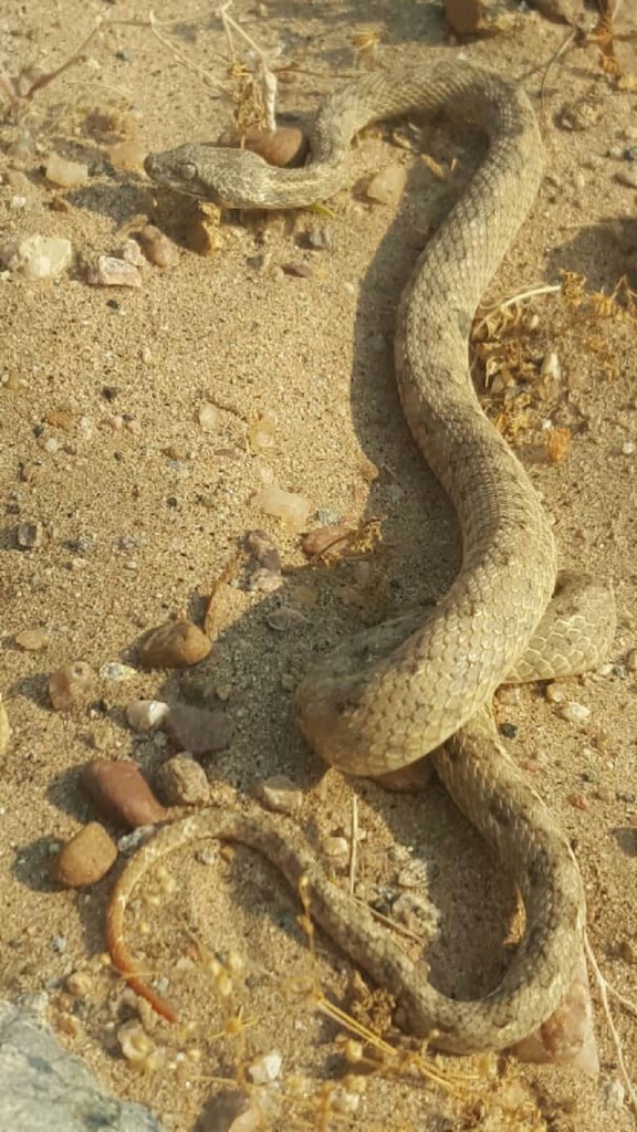 The Western Keeled Snake is pale buff to sandy grey above, with a series of brown, darker edged square blotches down either side of the back, with a orange or red tail. The head is python-like in shape and appearance, as the Latin name indicates.