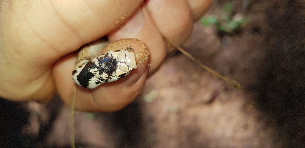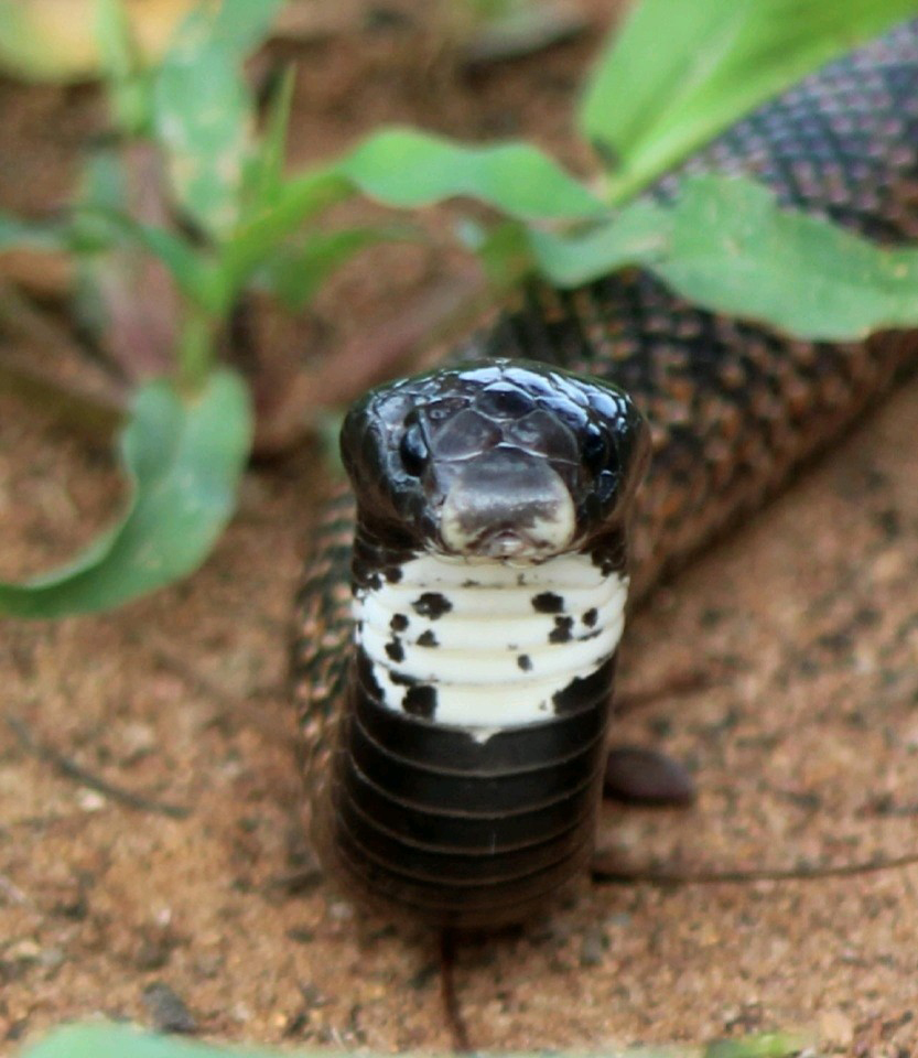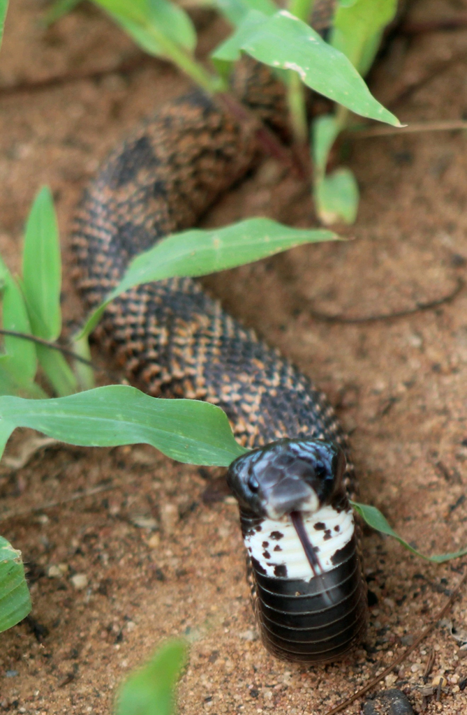 The Speckled Shield Cobra is reddish brown above with black blotches on the back. The head and neck area is black with white markings on the throat region. It is a short fat snake with a short stubby head and a large rostral (tip of nose) scale.