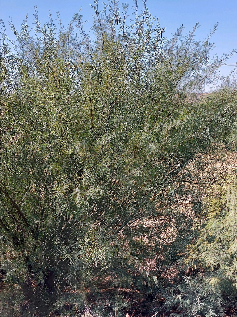 Widespread in Namibia, although often localised. Highly invasive in dry river beds, especially in the south-east, out-competing local trees and extremely water-hungry. The pods are nutritious fodder, while the wood burns well, and the sawdust is excellent for smoking fish and meat. These species produce masses of pollen in spring, to which many people are dangerously allergic. The City of Windhoek has a by-law that prohibits the planting of any of these species.