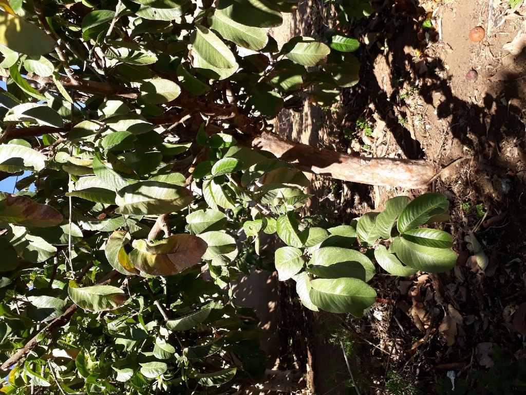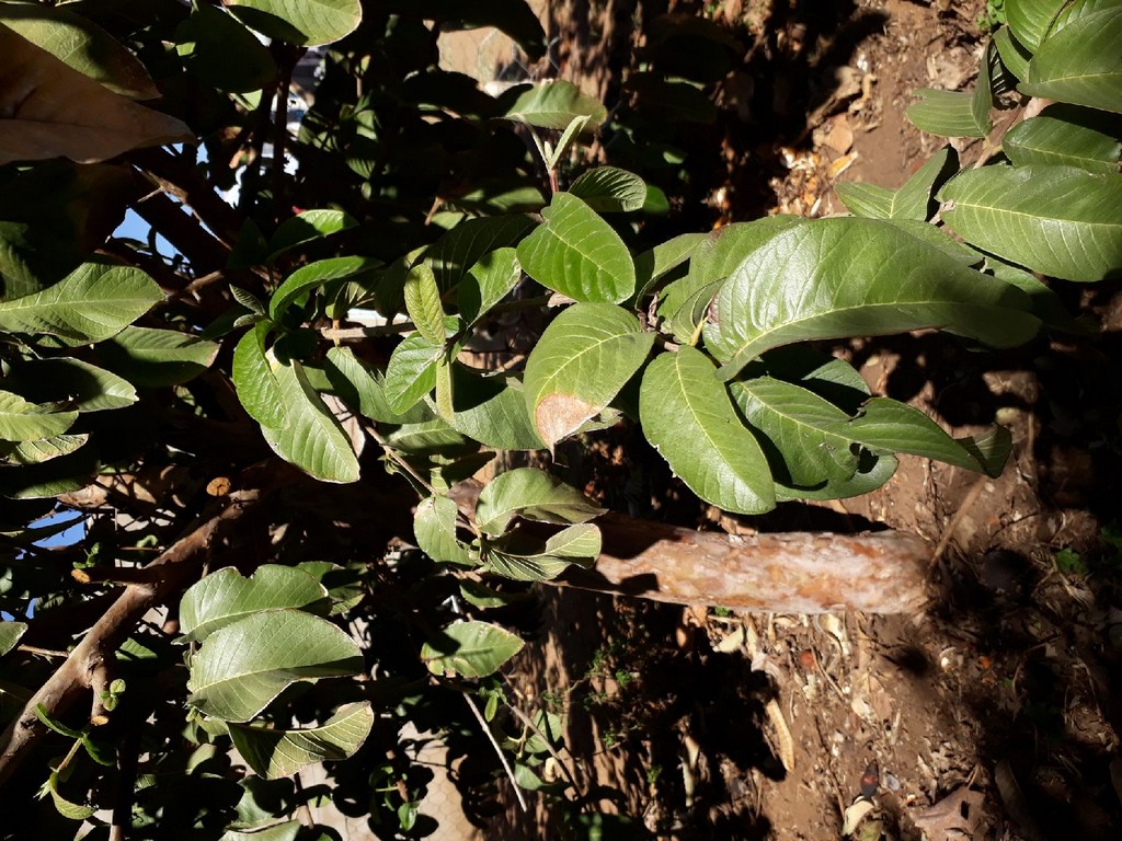 Evergreen shrub or small tree up to 6 m high, occasionally higher. Bark smooth, copper-coloured, sometimes peeling off to reveal greenish underbark; young branches four-angled and hairy. Leaves stiff, thick, hairy below, with pointed tip and conspicuous, parallel veins that are sunken above and prominent below. Flowers carried in groups of 1-3, white, with numerous stamens that give the flowers a fluffy appearance. Fruit ovoid, up to 10cm long, with persistent calyx remains at the tip, many-seeded, greenish becoming yellow, with white to yellow or pink flesh when ripe.