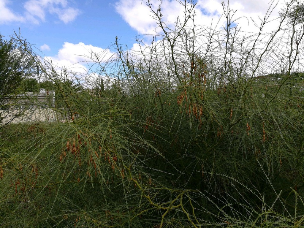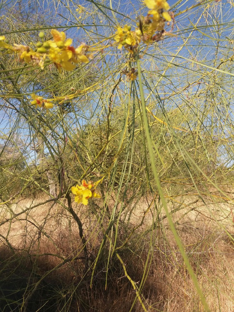 Evergreen single- or multi-stemmed tree. Branches smooth, greenish yellow; young branches droopy and slightly zig-zag, carrying stout, curved spines at the leaf bases. Leaves light green, consisting of a very long, slender, hanging, flattish midrib with many tiny leaflets spaced along it. Flowers sweet-smelling, with crinkly petals, yellow, upper petal flushed orange. Fruit a brown, narrow, slightly flattened pod with bulges around the seeds and points on both ends. Seeds bean-like, +10 x 4 mm, olive green to brown, usually 1-4 per pod, sometimes up to 11.